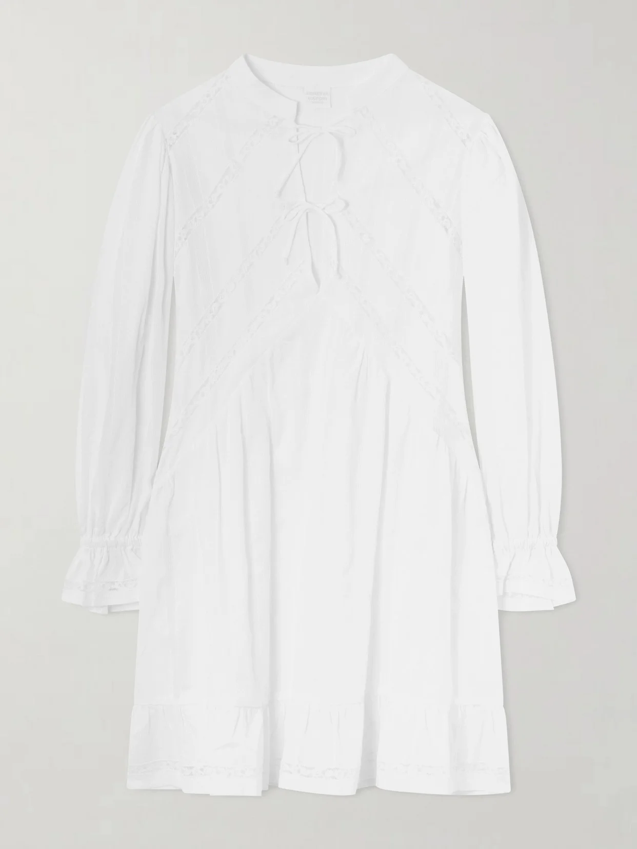 Loretta Caponi blends precision, texture, and heritage-inspired details. The ‘Recenati' dress is made from lightweight cotton with diagonal floral lace inserts along the bodice, ruffled hem, and cuffs, and its flowy mini skirt falls into soft pleats that move gracefully as you walk. Style it with sandals or ballet flats for a romantic springtime look.