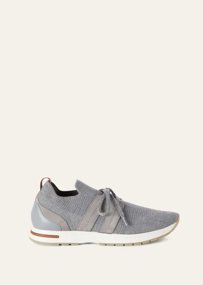 Sneaker in knitted Wish® wool crafted using an exclusive, very complex technique. Feather-light and super-comfortable, ideal for leisure time and lounging, and perfect with casual looks in the city. Product details Wish® is an exceptionally fine wool from selected Merino sheep bred in Australia and New Zealand The upper is machine-knitted just like a sweater, then joined to the ultra-light technical sole The sides of the shoe are finished with water-repellent suede Kummel-coloured loop on the heel with the Loro Piana logo White sole in ultra-light rubber with kummel-coloured inserts and tread featuring the Loro Piana initials Composition: 95% virgin wool 5% polyester Trim: 100% suede goatskin Made in Italy Product code: FAI7759