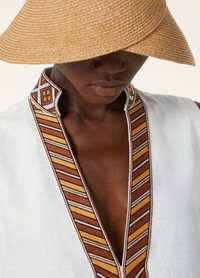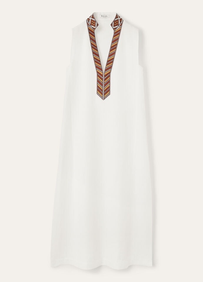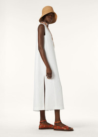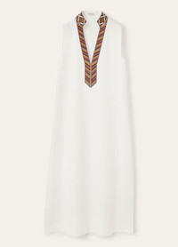 In soft and cooling Antigua linen, the Abril dress exudes quintessential summer charm. The fabric is a linen crepe with a distinct drill weave and offers a fluid, wrinkle-resistant look and exceptional comfort. The long tunic-style silhouette falls effortlessly, featuring a clean, sleeveless cut that skims the body. A geometric motif, embroidered in cotton thread, draws inspiration from the iconic Suitcase Stripe and its original colors, adding textural and visual interest. Product details Straight cut Long dress Sleeveless Small standing collar and V-neck Embroidered stripe at the neckline Side slits Regular fit Unlined Composition: 100% Linen Model wears an IT 40 Model measures: height 5′ 11″/ 180cm, bust 31.5″/ 80cm, waist 23.6″/ 60cm, hips 35.4″/ 90cm, shoes 16.1″/ 41cm. Made in Italy Product code: FAP0264