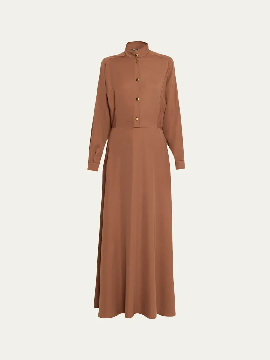 Loro Piana designs this sophisticated dress with a buttoned bodice and flared skirt, offering full coverage crafted from a silkwool blend. Stand collar Long sleeves Button front Aline silhouette Floor length Button cuffs Silk/wool Made in Italy SIZE amp; FITModel measurements: 5'10" tall Model is wearing a US size 4/Small