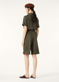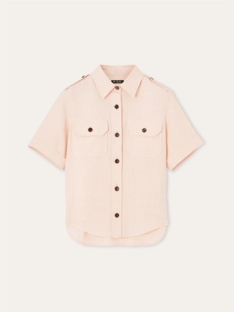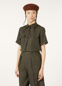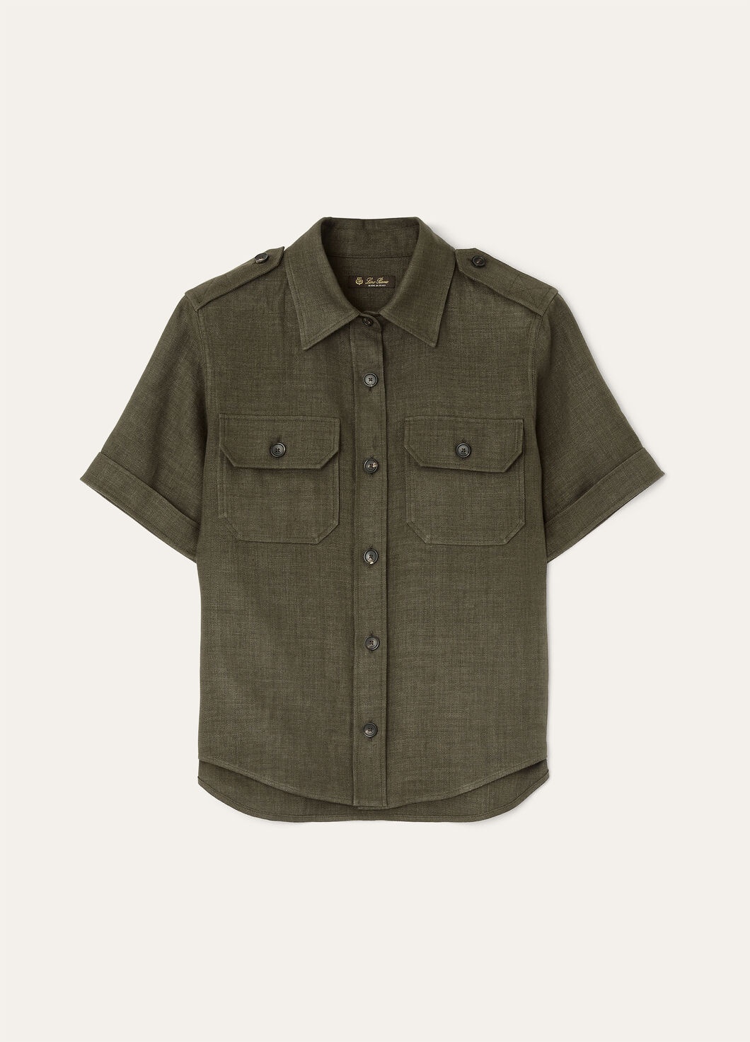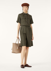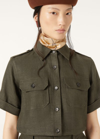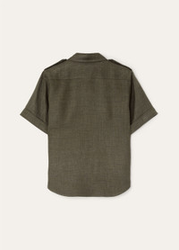 Short-sleeved shirt in a wool and linen fabric,featuring a compact texture that is very soft to the touch. A slim fit, the iconic military-style details lend the garment a strong masculine style. Product details Horn buttons Front flap pockets Toggles on the shoulders Composition: 70% Linen, 30% Virgin Wool Model wears an IT 40 Model measures: height 5′ 10″/ 179cm, bust 30.3″/ 77cm, waist 23.2″/ 59cm, hips 35.0″/ 89cm, shoes 15.4″/ 39cm. Made in Italy Product code: FAM7333