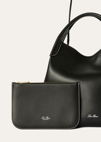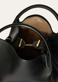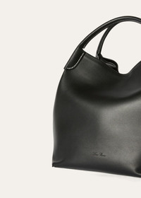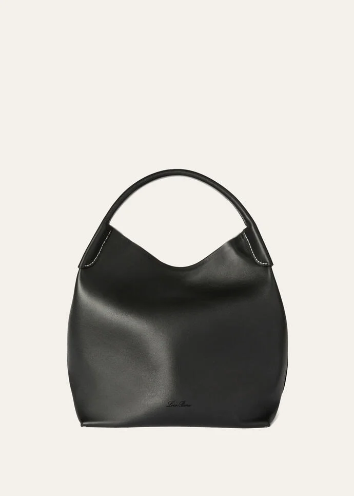 The Bale, a sophisticated bucket bag in a large size with handstitched handles, inspired by Loro Piana’s textile heritage. Its silhouette, touch, and feel recall the cashmere bales, large bundles of the raw precious material. With a seamless design and unique lightness, the Bale bag is a celebration of supple softness and encapsulates the savoir-faire of the Maison. Effortless and casual, it is ideal for carrying all daily essentials with ease. The bag can be carried by hand or crossbody thanks to its removable strap. This handcrafted style is made from luxury calfskin. Product details Size: Large 24 x 20 x 27 cm (9.5" x 7.9" x 10.6") Handle Length: 11 cm (4.3") Strap Length: 40 cm (15.8"). A detachable, cotton-and-leather shoulder strap wraps around the entire bag like a ringThe shoulder strap features two holes, so its length can be adjusted, allowing the bag to be carried by hand, over the shoulder or as a crossbody styleBejeweled metal inside closure with Antique Silver finishLightly padded and lined in soft suedeRemovable, coordinated inside leather pouch that attaches to the bag with a toggle Contrasting-colored, embossed Loro Piana logo on the frontOutside base lined in leatherComposition: 100% CalfskinSpecific Features: 100% Suede Made in Italy Product code: FAN0806