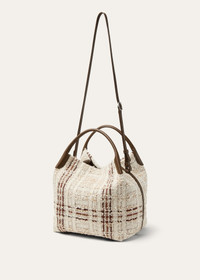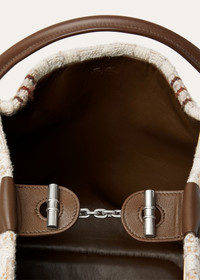 Inspired by Loro Piana’s cashmere bales – bundles of precious raw fiber – the Bale bag is a sophisticated bucket style steeped in the Maison’s rich textile legacy. With its sensorial touch, unique lightness, and seamless finish, this large edition is primed for everyday elegance and can be carried in the hand or over the shoulder. It is crafted from tactile Check Tweed with hand-stitched handles and a signature toggle fastening. Product details Removable and adjustable leather strap Internal metal toggle fastening Internal leather pouch with toggle Double-layer leather base Hardware detailing Dimensions: 28 x 36 x 22 cm / 11" x 14.2" x 8.7" Handle drop: 11 cm / 4.3" Strap drop: 40 cm / 15.8" Lined in leather Weight: 930 g / 2.1 lbs Composition: 65% Virgin Wool, 28% Silk, 4% Cashmere, 3% Microfiber Made in Italy Product code: FAQ2311