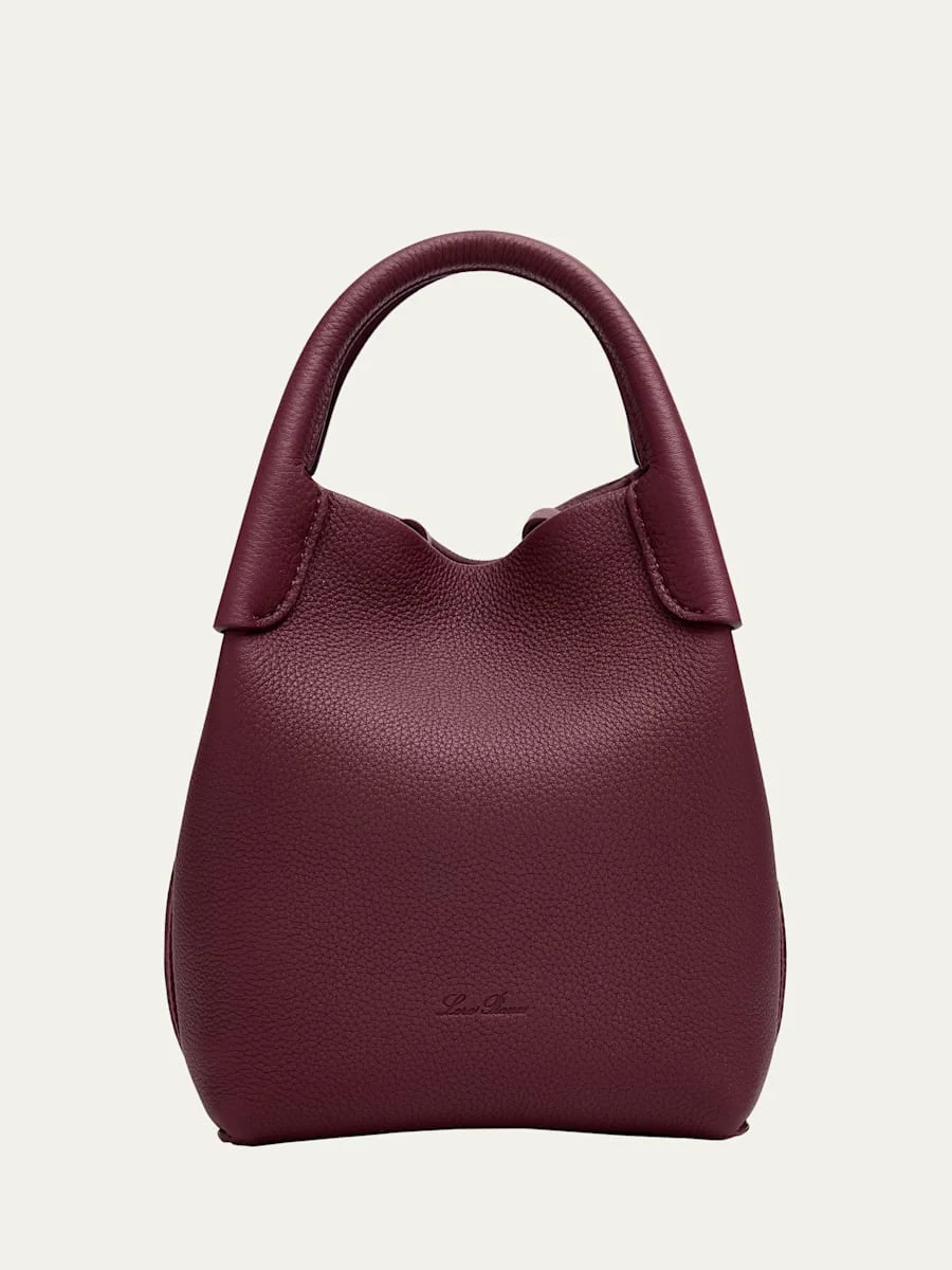 Loro Piana "Bale" crossbody bag in grained leather Rolled top handles Detachable, adjustable web crossbody strap Can be worn as a top handle or crossbody bag Open top with extended chain strap closure Approx. 9.1"H x 6.3"W x 5.5"D Wipe clean Made in Italy