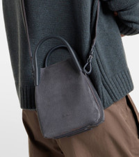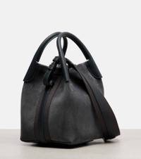 The Bale bucket bag by Loro Piana is crafted from grained leather and comes with the brand's logo at the base. This Micro iteration is finished with a removable strap for crossbody wear and a detachable pouch. Product Details - Material: calf leather - Lining: lamb leather - Made in Italy - Designer color name: Blue Green/Sun Gold - Item color: blue - Top handles, Detachable shoulder strap - Internal details: single compartment - Closure: toggle fastening - Hardware color: gold - Item number: P01076013 Size & Fit - Height 17cm-6.5" - Max. width 13cm-5" - Max. depth 13cm-5" - Length of handle 18cm-7" - Adjustable shoulder strap - Min. length shoulder strap 120cm-47" - Max. length shoulder strap 124cm-49"