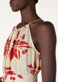 The graceful suppleness of linen captures the vibrant yet delicately ephemeral beauty of Japanese hibiscus print, the petals woven like brushstrokes. Breezy linen also lends itself to this relaxed halter jumpsuit with hand-woven shoulder ties. Its wide-leg silhouette can be cinched at the waist with the matching belt, making it perfect for transitioning from beachside to cocktail soirées. Product details Plaited shoulder straps applied by hand Composition: 100% Linen Model wears an IT 36 Model measures: height 5' 10.9"/ 180cm, bust 32.3"/ 82cm, waist 23.6"/ 60cm, hips 35.4"/ 90cm. Made in Italy Product Code: FAN6976