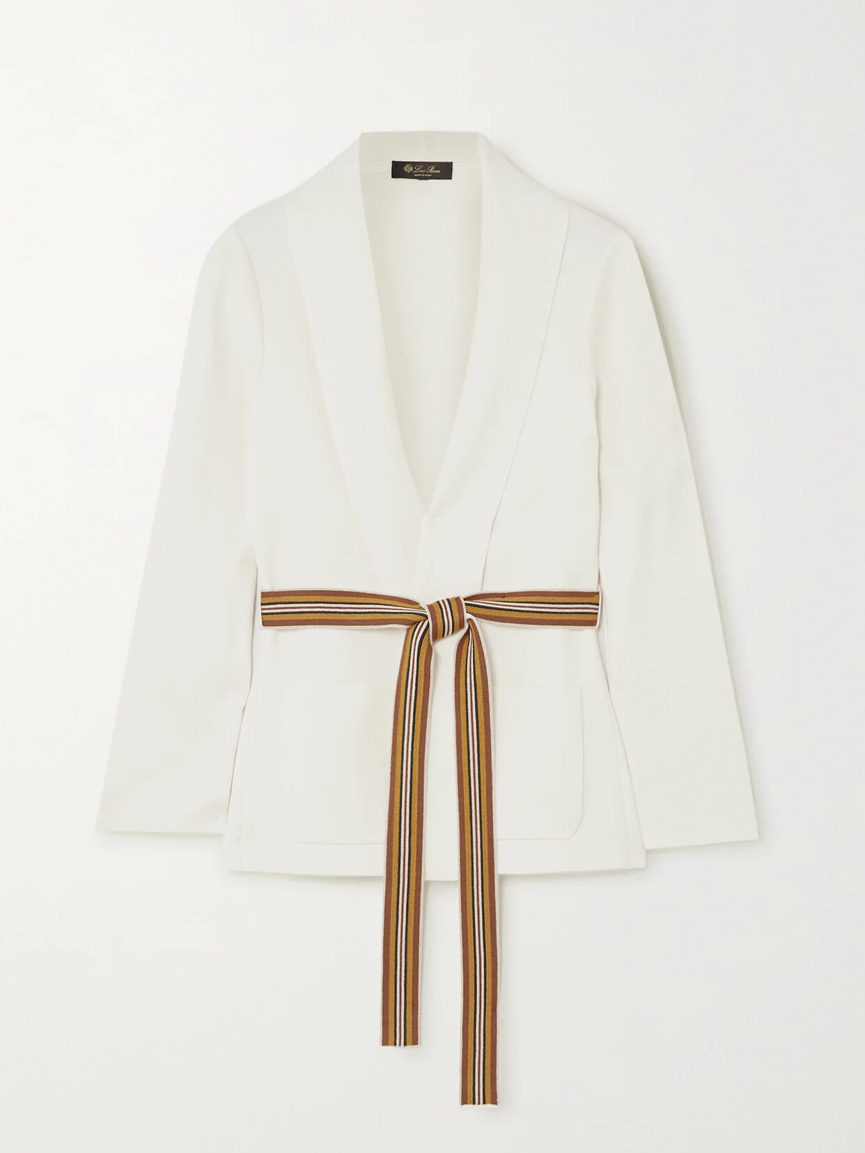 Loro Piana has produced luxurious, high-quality textiles out of the finest raw materials for six generations, so rest assured knowing it's pieces will really last. This cardigan has been made in Italy from silk and cotton-blend in a slim silhouette and has shawl lapels and a striped belt to cinch the waist. Layer it over a tank or lacy camisole. Shown here with: [Bottega Veneta Pants id1206483], [Deveaux Tank id1208946], [Bottega Veneta Clutch id1206767], [Loro Piana Sandals id1220488], [Piaget Ring id1167476].