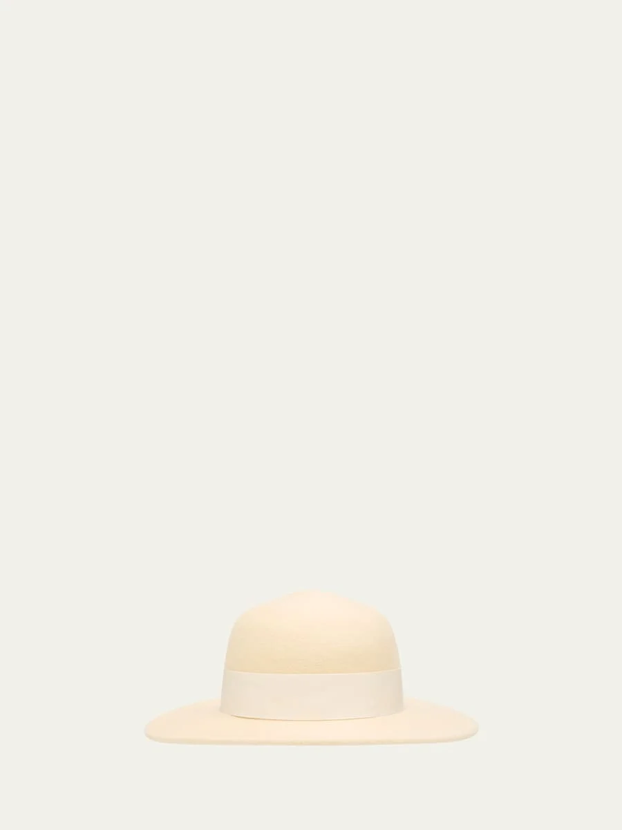 Loro Piana "Blanca" hat exudes timeless charm with its wide ribbon that ties into a fetching bow on the nape. Crafted from My Felt Cashmere, a pure cashmere felt known for its compact surface and velvety feel. Round crown Wide brim Grosgrain trims interior Approx. 3.1" brim Cashmere Dry clean Made in Italy