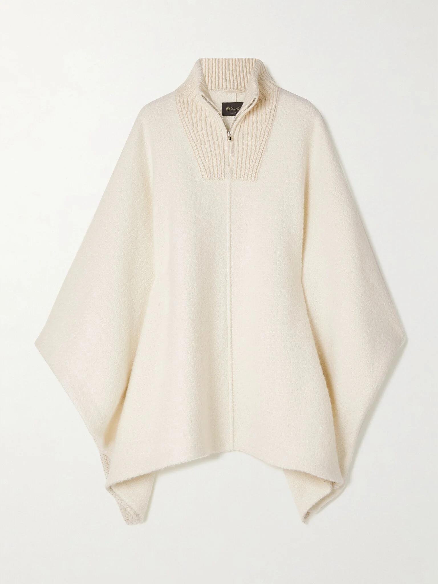 The soft cashmere and silk-blend of Loro Piana's 'Britney' poncho beautifully enhances its billowy shape. Crafted in Italy, it has voluminous sleeves and a ribbed turtleneck to protect you from the elements. Echo the brand styling and wear yours as part of a tonal outfit. Size & Fit - Fits true to size, take your normal size - Designed for a slim fit across the shoulders, loose fit through the body - Mid-weight knit - Model is 177cm/ 5'10" and is wearing a size Small Details & Care - White cashmere and silk-blend - Zip fastening along front - 89% cashmere, 11% silk - Dry clean