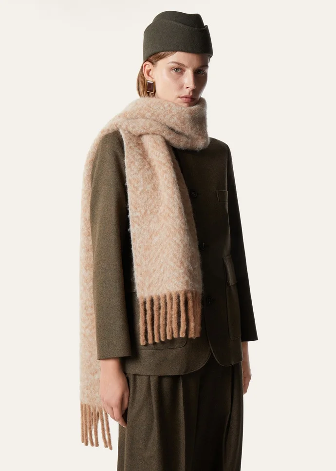 A considered layer for the cooler season, this scarf is woven from a cloud-soft alpaca blend for insulating warmth. It is gently brushed and traced with a chevron jacquard motif, rendered in dual-toned yarns that shift with the light. Product details Twisted fringe trim Dimensions: 200 x 20 cm | 78.7 x 7.87 in Composition: 80% Alpaca, 20% Microfiber Please note that this product contains fur and therefore cannot be shipped to California Made in Italy Product code: FAQ0492