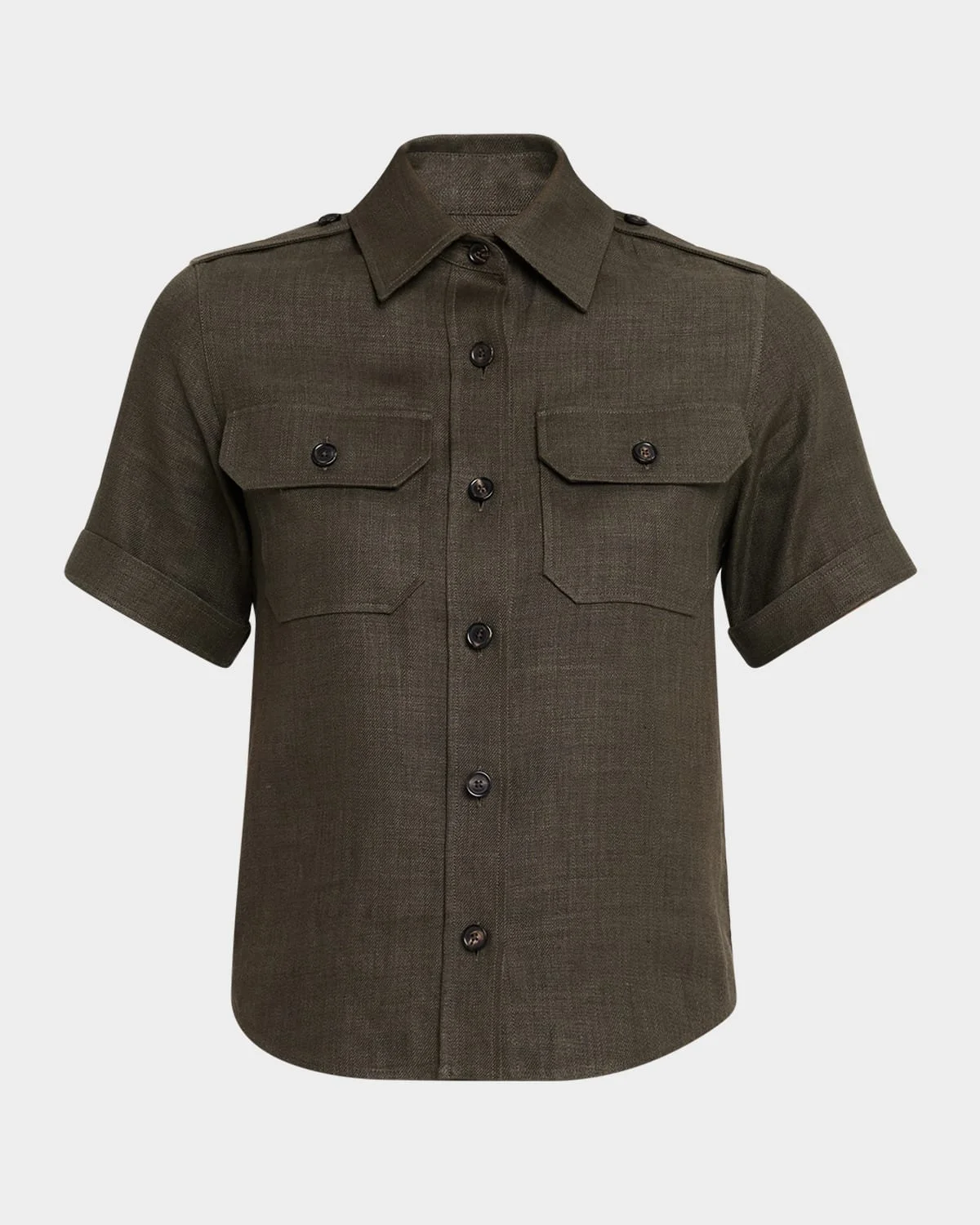 Loro Piana "Annalisa" buttonfront blouse in a structured linen and wool blend Point collar Short sleeves Front patch pockets Back yoke Hip length Curved hem Relaxed fit Linen Made in Italy