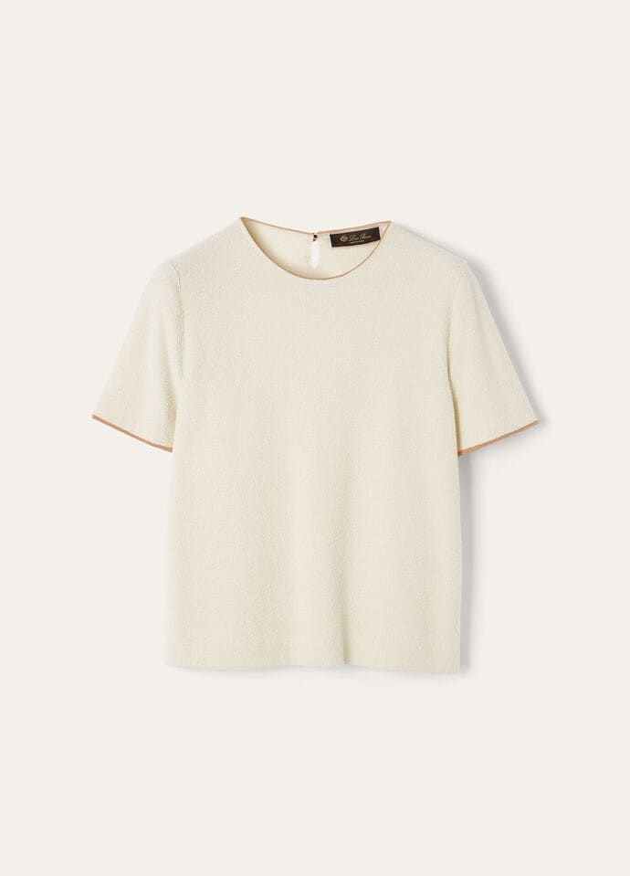 A refined example of summer knitwear, the Cannareggio crewneck sweater is spun from an exquisite fusion of Sea Island cotton and silk organzine, creating a refined three-dimensional knit reminiscent of terry cloth. It is traced with a contrasting fine neck trim and secures with a keyhole at the nape, balancing a polished look with effortless ease. Product details Round collar Thin ribbing at the cuffs Short sleeves Keyhole fastening at the back with metal and tonal enamel button Thin ribbing at the hem Loop stitch Regular fit Gauge 18 Composition: 70% Silk, 30% Cotton Model wears an IT S Model measures: height 5′ 11″/ 180cm, bust 31.5″/ 80cm, waist 23.6″/ 60cm, hips 35.4″/ 90cm, shoes 16.1″/ 41cm. Made in Italy Product code: FAO9968