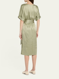 Loro Piana "Caren" double satin dress Bateau neckline Elbow-length sleeves Self-tie waist Midi length A-line silhouette Silk Made in Italy Online Inquiries: BGS21_B9SJ0| Store Inquiries: #4956634