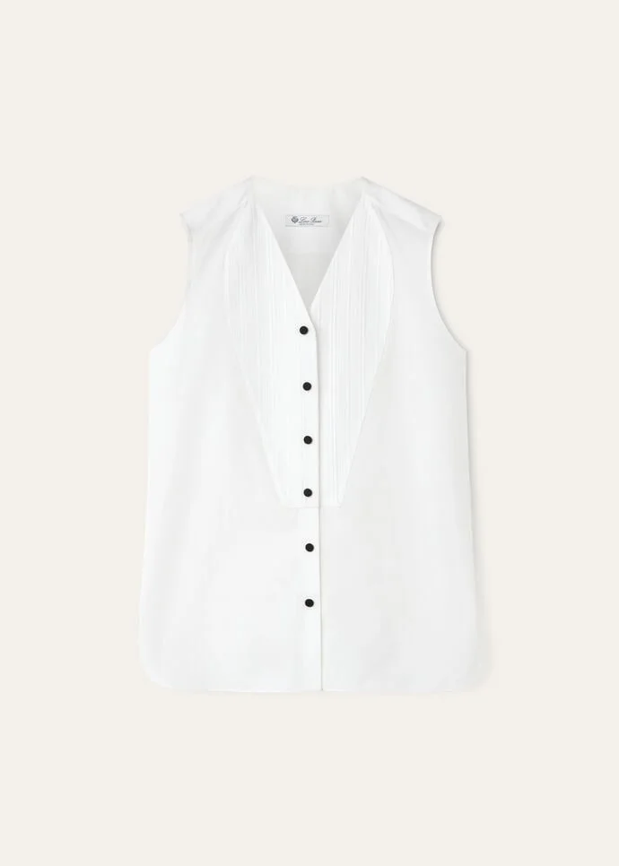 In the soft glow of the evening, the Caylee top emerges as a vision of refinement untouched by the passing of time. This sleeveless cotton-poplin blouse is a statement of elegance, its V-neckline framing a refined pleated bib in a lustrous silk blend that catches the light with subtle sophistication. Silk-covered buttons add a further touch of luxury. Product details Contrasting black buttons Composition: 100% Cotton Model wears an IT 36 Model measures: height 5′ 10″/ 179cm, bust 30.3″/ 77cm, waist 23.2″/ 59cm, hips 34.3″/ 87cm. Product code: FAO4070