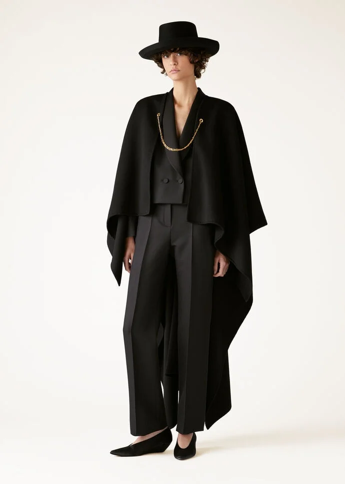 In the soft glow of the evening, the Cecilia cape emerges as a vision of refinement untouched by the passing of time. Crafted from double-layered cashmere, its asymmetric line creates a dynamic interplay of light and shadow as you move. The golden chain fastening, looped through shimmering eyelets, adds a subtle touch of opulence, making this the ideal choice for adding drama to a simple evening gown. Product details Necklace with snap hook and gold-plated metal eyelets Gold-finished metal eyelets on both sides of the fabric Composition: 100% Cashmere Product code: FAO6420