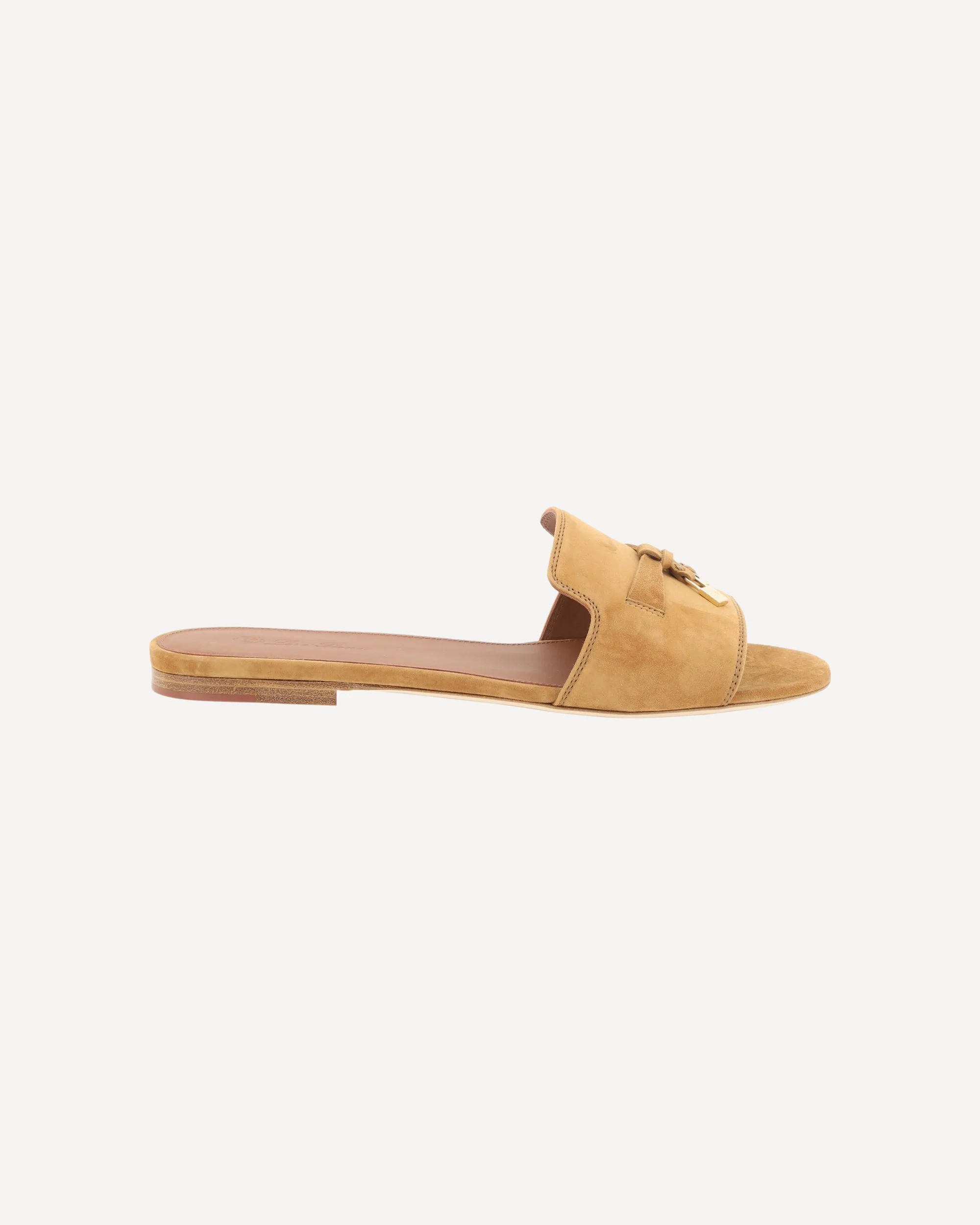 Loro Piana's leather Charms Sandals are an elegant and refined accessory, ideal for a sophisticated summer look. The flat sole ensures comfort, while the slightly elongated toe adds a touch of understated elegance. The suede front band is embellished with an applique detail featuring the brand's engraved monogram, giving it a distinctive and recognizable touch. The branded insole completes the design with an additional luxury detail. DETAILS sku FAI5580_E449 composition: LAMB OVIS ARIES ARIES 100% GOATSKIN/HIRCUS GOATSKIN 100% color group: BEIGE gender: WOMAN season: SS25 size chart: SHOES IT category name: SANDALS