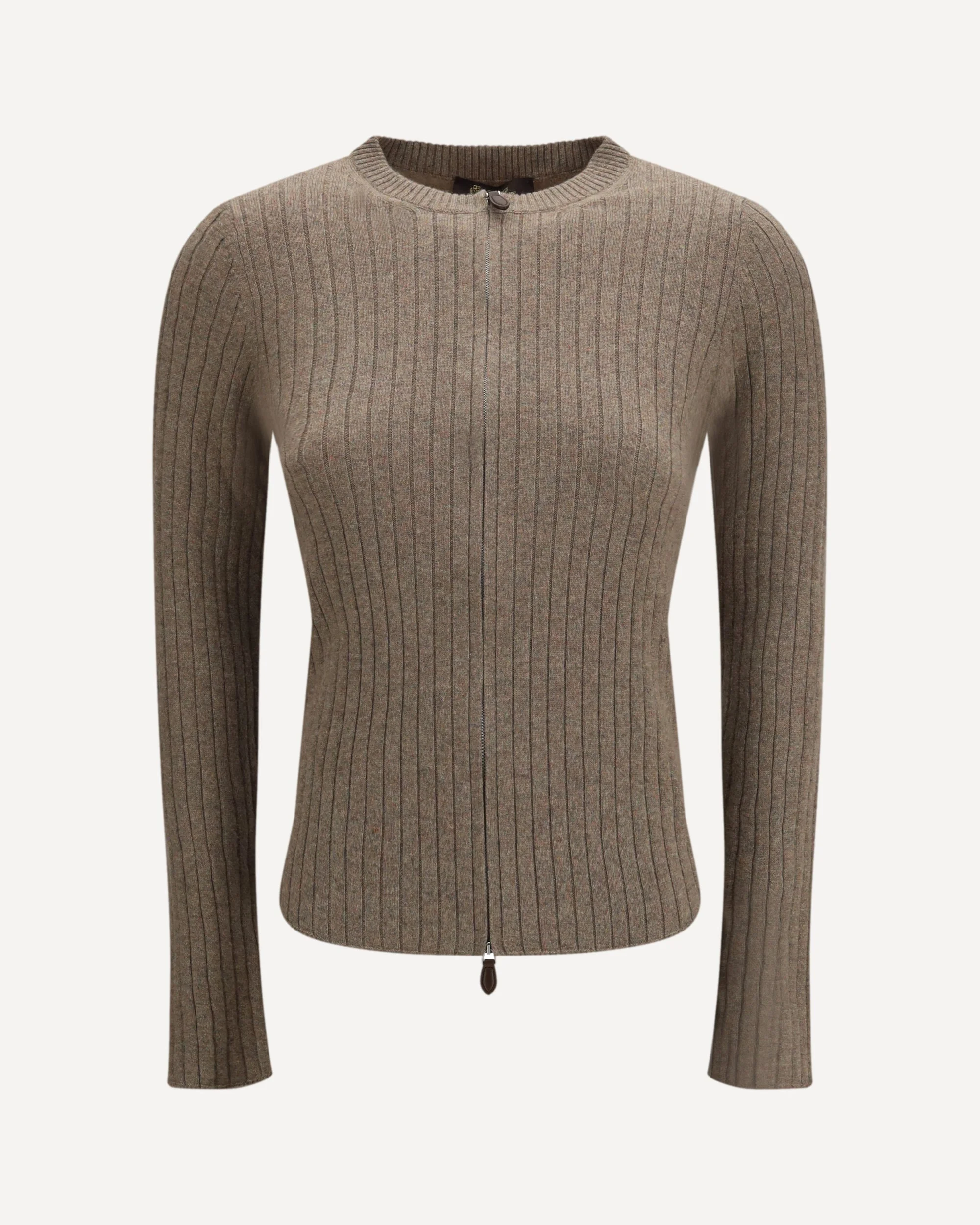 The Coste bomber-style knit by Loro Piana is crafted from ribbed melange baby cashmere, designed to provide warmth and lightness during transitional seasons. Defined by a slim fit and a feminine, close-fitting silhouette, it enhances the softness of the yarn through refined ribbed knitting. The design features a ribbed crew neckline, long sleeves, and a two-way zip closure with a leather puller, while flat rib seams ensure a clean and elegant finish. Gauge 12. DETAILS - Sku: FAP5839_H19J - Season: SS26 - Fit: Slim - Composition: GENERAL 100% Kashmir/capra Hircus - MADE IN ITALY