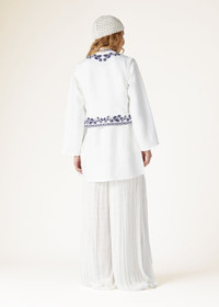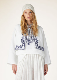 Ancient myths mingle with delicate floral patterns in our antique-inspired Greek embroidery. Delicate flowers adorn this featherlight linen vest. Its collarless cut and open front silhouette add an airy elegance to summer ensembles. Product details Composition: 100% Linen Model wears an IT 36 Model measures: height 5' 9.7"/ 177cm, bust 31.1"/ 79cm, waist 22.8"/ 58cm, hips 34.3"/ 87cm. Made in Italy Product Code: FAO0396