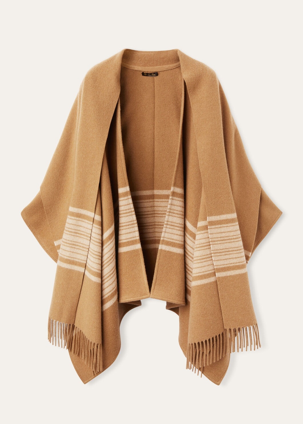 The Daisy cape is a delicate whisper of elegance, an exquisite flourish of texture that exalts the very poetry of fashion. A new take on the classic silhouette, this piece envelops you in sublime softness, crafted from the finest cashmere in naturally rich tones. A front opening with an attached scarf perfectly frames the neckline in soothing warmth, while the striped motif is reminiscent of Loro Piana's iconic Suitcase Stripe. Product details Composition: 100% Cashmere Made in Italy Product code: FAO5618