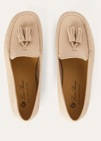 New Loro Piana driving shoes made from soft deerskin. Their laid-back allure is enhanced by rubber soles, LP logo rubber pads and sabot-style collapsible heels. This lightweight, flexible style is enhanced Loro Piana My Charms tassels. Product details California Construction: The leather lining is constructed on a shoe last, ensuring it fits like a glove. Kidskin interior Poron foam padding under the insoles for increased comfort Composition: 100% Deerskin Specific Features: Lining: 100% Kidskin; Soles: 100% Rubber Made in Italy Product code: FAM9209