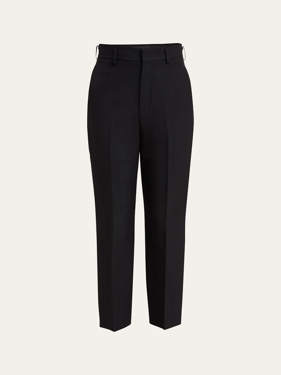 Loro Piana "Doyle" trousers with creased legs Cropped length Mid rise sits high on hip Straight legs Side slip pockets; back welt pockets Tab/zip fly; belt loops Virgin wool Dry clean Made in Italy