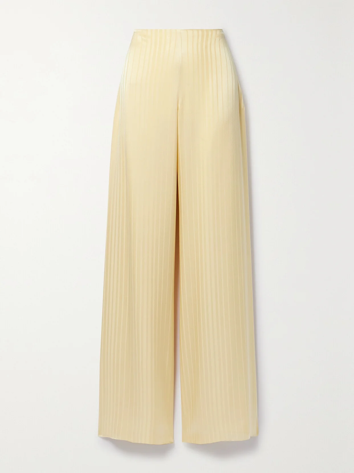Loro Piana's pants are made from silk-satin that's jacquard-woven with subtle, elongating stripes - from afar, the material resembles a ribbed-knit. They're designed to sit high on the waist and have wide, floaty legs that pool at the floor.