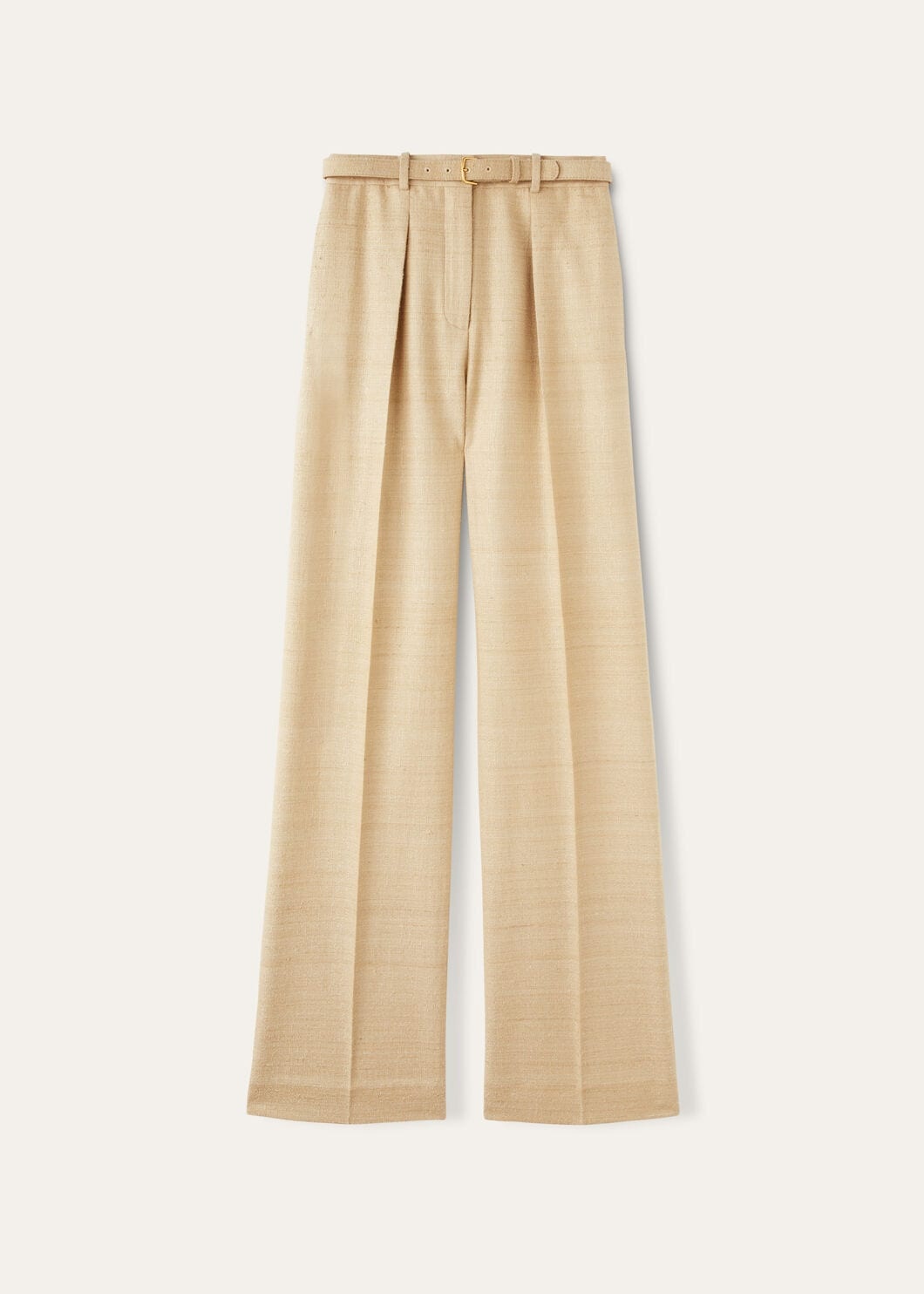 Our women's pants collection is an exquisite melee of masculine and feminine elements, framing the female silhouette in clean, sculpted lines and refined nuances. A sophisticated treat for the discerning wearer, these raw silk pants offer a straight and relaxed cut that drapes elegantly, while the pleats at the waist and pressed crease add a note of ageless refinement. A classic waistband with internal logo and a tailored belt in the same fabric, complete with metal buckle and embroidered eyelets, raises these pants to a new level of understated beauty. Product details Classic preformed waistband with logo inside Rear welt pockets Pockets lined in silk Composition: 100% Silk External belt: 100% Silk Internal belt: 100% Calfskin Model wears an IT 36 Model measures: height 5′ 10″/ 179cm, bust 32.3″/ 82cm, waist 23.6″/ 60cm, hips 34.6″/ 88cm. Product code: FAO3552