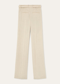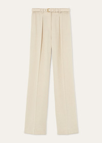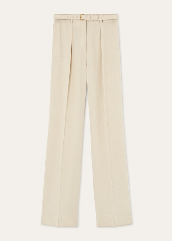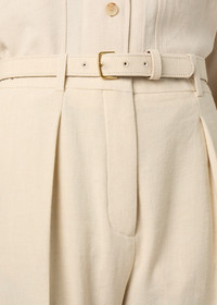 Classic and rich in character, the Edward pants are tailored from textured linen and wool crepe produced by the experts at Solbiati, part of the Maison since 2013. They are cut with a straight line with two pleats at the waist and an elegant pressed crease. The same-fabric belt adds a considered finish to the silhouette. Product details High-rise waist Straight cut; front pleat Straight side pockets; welt pockets on the back Zip, hook and button fastening Horn buttons Belt loops with fabric-covered belt Unlined Regular fit Composition: 52% Linen, 48% Virgin Wool Made in Italy Product code: FAQ1296