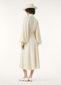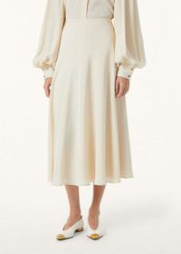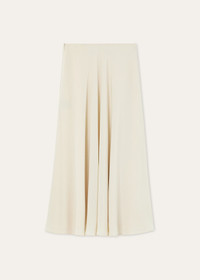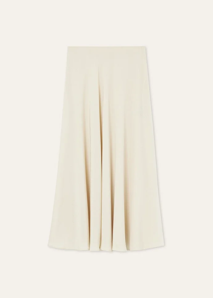 Cut on the bias, the Erika skirt casts a flared silhouette that moves with graceful fluidity. Its silk crepe de chine fabric is worked with an intricate jacquard weave – a raised dot repeat pattern, creating a rich visual and tactile finish. The design is anchored by a discreet inner waistband in grosgrain, and lined in silk for a refined feel against the skin. Product details Mid-rise waist Flowy A-line cut Below the knee Zip and hook side fastening Micro square pattern Underskirt Regular fit Composition: 100% Silk Made in Italy Product code: FAQ4013