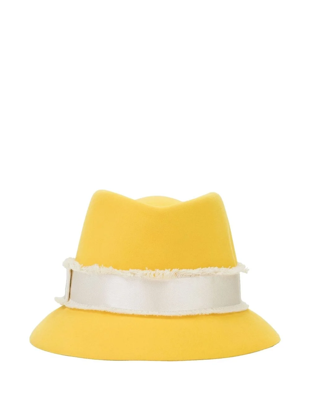 felt fedora hat Highlights - Banana yellow - Dropped narrow brim - Concave crown - Satin trim - Fringed edge Imported Composition Fabric 100%