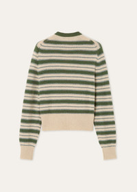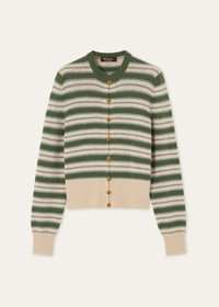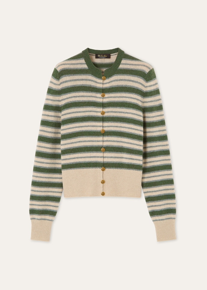 Knitted from the Maison’s iconic baby cashmere, the Fobello Stripes cardigan melds enveloping warmth with incredible lightness. Its rare fiber comes from the underfleece of goat kids who can only be shorn once in their infancy. The horizontal stripe motif feels timeless and characterful at once. Product details Ribbed round collar Ribbed cuffs Long sleeves Metal button fastening Horizontal bi-color stripes High ribbed hem Regular fit Plain stitch Gauge 7 Composition: 100% Baby Cashmere Made in Italy Product code: FAP5927