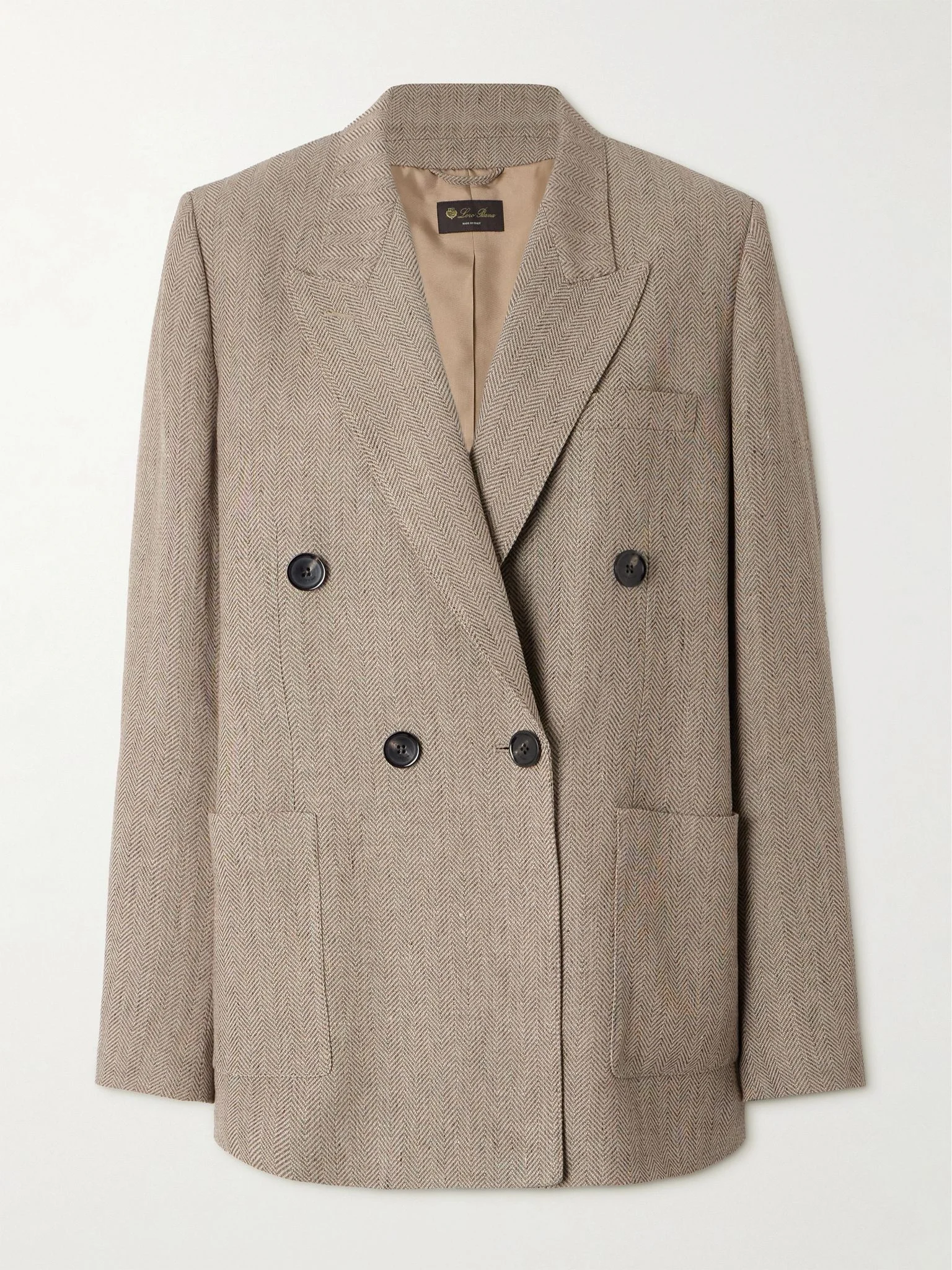 Loro Piana's 'Genny' blazer is a smart way to stay cool and look polished during the warmer months. Made from linen with a classic herringbone weave, it has a double-breasted design with peak lapels and padded shoulders. Complete the set with the coordinating pants in our edit. Size & Fit - Fits true to size, take your normal size - Take the next size down if you wish to achieve a closer fit - Designed for a slightly loose fit - Internal shoulder pads - Lightweight, non-stretchy fabric - Model is 177cm/ 5'10" and is wearing an IT 40 Model measurements: - Bust: 80cm/ 31.5" - Waist: 60cm/ 23.5" - Hip: 89cm/ 35" Details & Care - Brown herringbone linen - Button fastenings through double-breasted front - 100% linen; buttons: 100% horn (Buffalo); lining: 100% silk - Dry clean