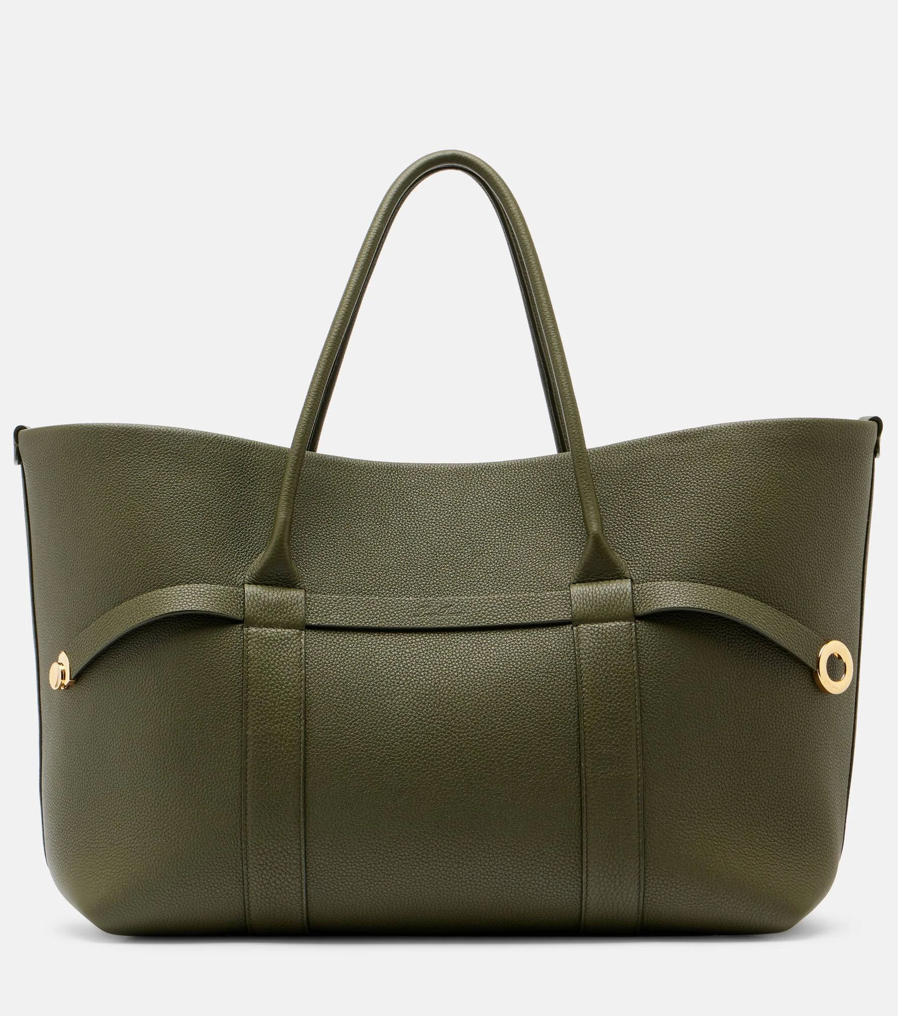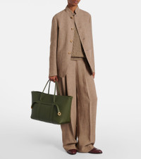 Product Details - Material: calf leather - Lining: cashmere - Made in Italy - Designer color name: Ribbon Green/ Sun Gol - Item color: green - Details: lamb leather - Hardware color: gold - Top handles - Closure: toggle fastening - Detachable zipped pouch - Item number: P01076010 Size & Fit - Height 27cm-10.5" - Width 48cm-19" - Depth 15cm-6" - Length of handles 56cm-22" - Clutch height 13cm-5" - Clutch width 19,5cm-7.5"