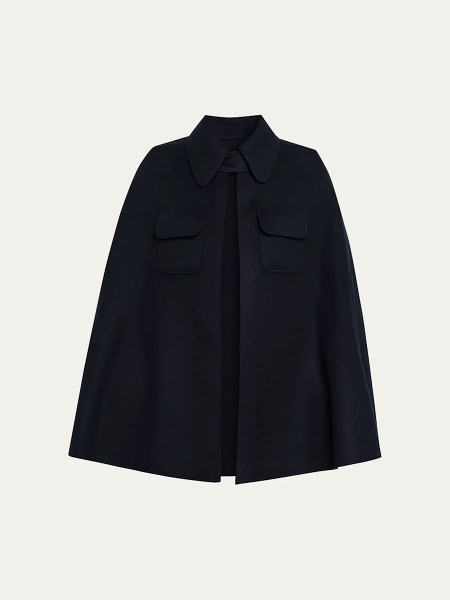 Crafted from soft, plush cashmere, the "Gilda" outer layer cape from Loro Piana channels classic trench coat style. Approx. 29.9"L from shoulder to hem Point collar with button tab closure Armholes trimmed with contrasting Plonge leather Two front flap patch pockets Easy fit Cashmere Dry clean Trim: Leather Made in Italy