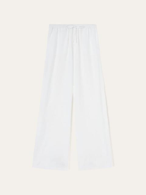 Inspired by lazy days spent lounging on faraway beaches, these relaxed, wide-legged Loro Piana pants are defined by a natural linen fabric weave. The material is treated with a soft aloe finish that resists wrinkles, while providing a flowing drape. A comfortable, loose-fitting style featuring an elastic drawstring waist that is perfect for summertime lounging. Product details Front welt pockets with vertical openings Monochromatic, embroidered Loro Piana logo on the left leg Composition: 100% Linen Made in Italy Product Code: FAN1238