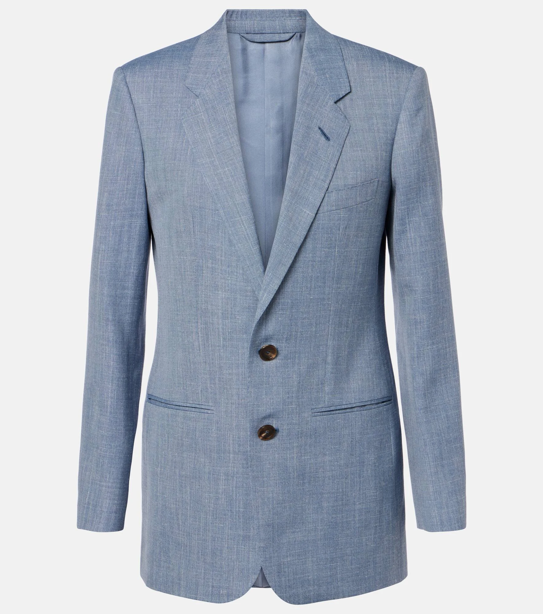 Every Loro Piana design combines the best of Italian craftsmanship with the finest raw materials. The Guia jacket is made in Italy from wool, silk, and linen to a single-breasted design with structured shoulder pads. Product Details - Material: 71% wool, 15% silk, 14% linen - Care instructions: dry clean - Made in Italy - Color: blue - Designer color name: Rain Blue - Closure: single-breasted (two buttons) - Notched lapel - Lining: 100% silk - Shoulder pads - Cuff: four buttons - Pockets: welt pockets, angled chest pocket - Item number: P01173097 Size & Fit - True to size - Shoulder pad inserts - Cinched waist - Non-stretchy fabric - Falls below the hip - The model seen in the picture is 178cm-5'10" and wearing a size IT 40