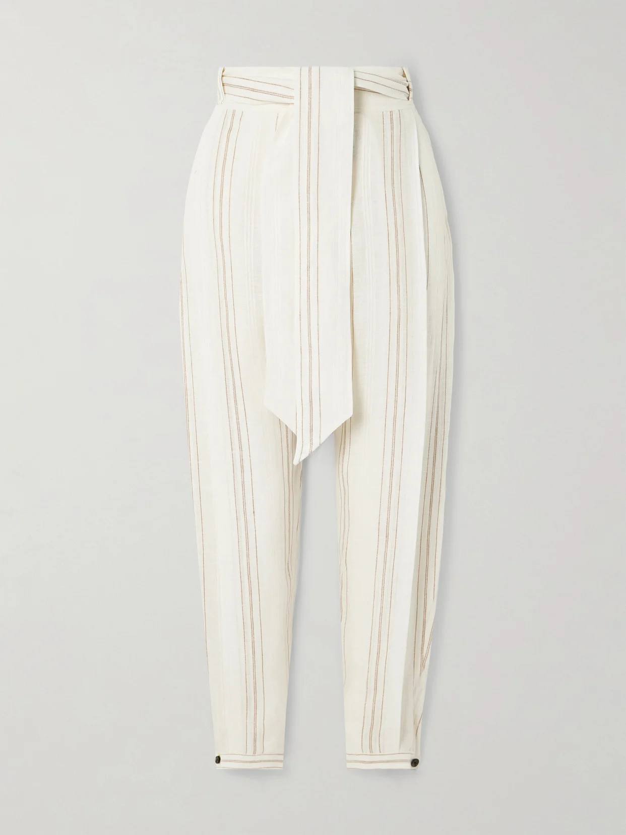 Loro Piana's 'Gustel' pants are so effortlessly elegant. Made from breathable linen in a striped pattern, they're cut for a high-rise tapered silhouette and have a matching belt to cinch at the waist. Style yours with the matching blouse.