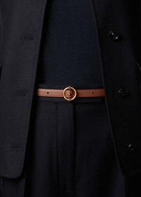 The Helm belt reflects the rich heritage of Loro Piana, seamlessly pulling each look together with understated finesse. It features a butter-soft leather construction and signature rounded silhouette, punctuated by a sleek golden ring buckle. The exclusive hide promises an instantly recognizable touch of refined versatility. Product details Punch buckle for width adjustment Height: 1.5 cm / 5.9 in Composition: Outer 1: 100% Calfskin Outer 2: 100% Cowhide Product code: FAP5146
