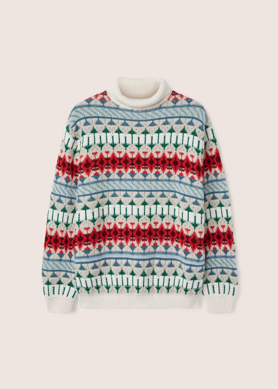 Christmas in the mountains: a warm, cozy knitwear capsule collection for celebrating the holidays in extraordinarily comfortable cashmere. Crafted from compact, fluffy Coarsehair® yarn, this flowing turtleneck features a sumptuous, multi-colored jacquard weave. A one-of-a-kind cashmere style with the vintage-allure of a Fair Isle pattern. Product details Ribbed collar, cuffs and hem Composition: 100% Cashmere Product Code: FAN6686