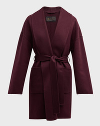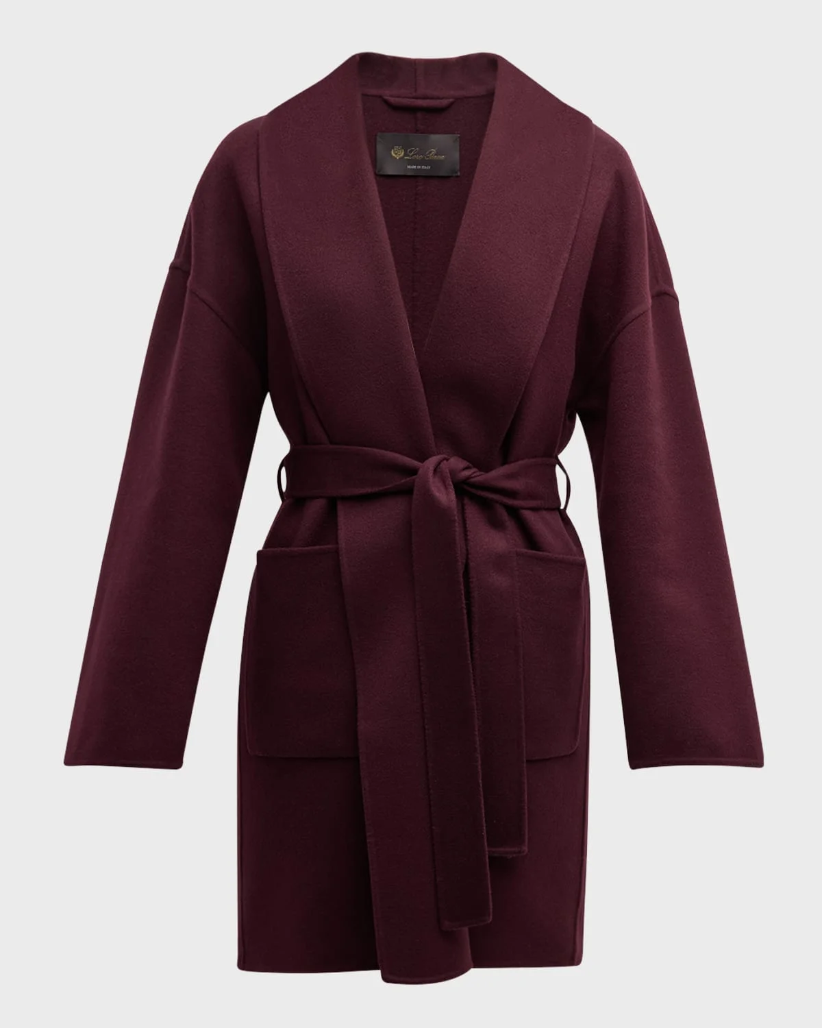 Loro Piana "Jed" coat in double brushed cashmere Shawl collar; singlebreasted front Long sleeves Selftie belted waist Side patch pockets Straight fit Hem falls below the hip Cashmere Made in Italy