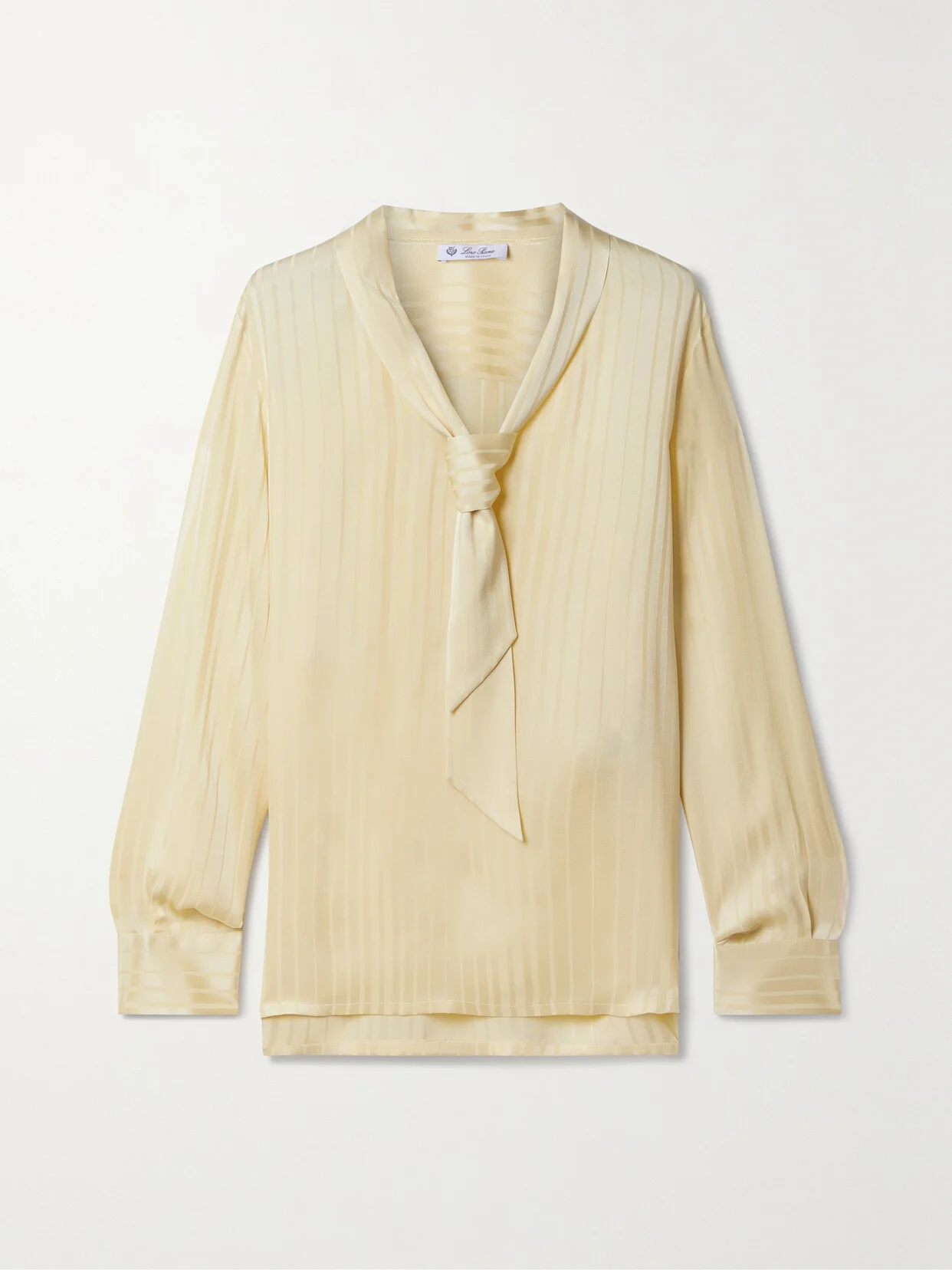 Loro Piana's elegant 'Kya' blouse has elongated neck ties you can knot into a bow. It's been crafted in Italy from fluid silk jacquard woven with tonal stripes. Wear it tucked into tailoring for the office or happy hour.