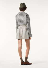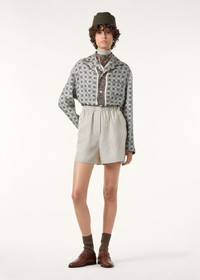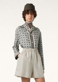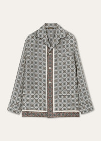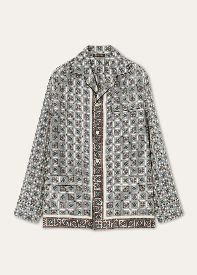 Inspired by the sophistication of the 1920s, the Lian shirt is defined by its wide-faced collar modeled on the iconic Andre shirt. It is crafted from fluid silk twill and is emblazoned with the Loro Piana Mendoza Border print, an homage to the same-named city in Argentina. Versatile and classic, it is ideally suited for at-home dressing and pairing with casual ensembles alike. Product details Spread collar Two patch pockets on the chest; small patch pocket on the chest Trimmed wrap-up cuffs Long sleeves Mother-of-pearl button fastening Floral tile print Contrast trims on profile Slightly oversized fit Composition: 100% Silk Made in Italy Product code: FAP8299