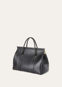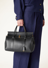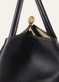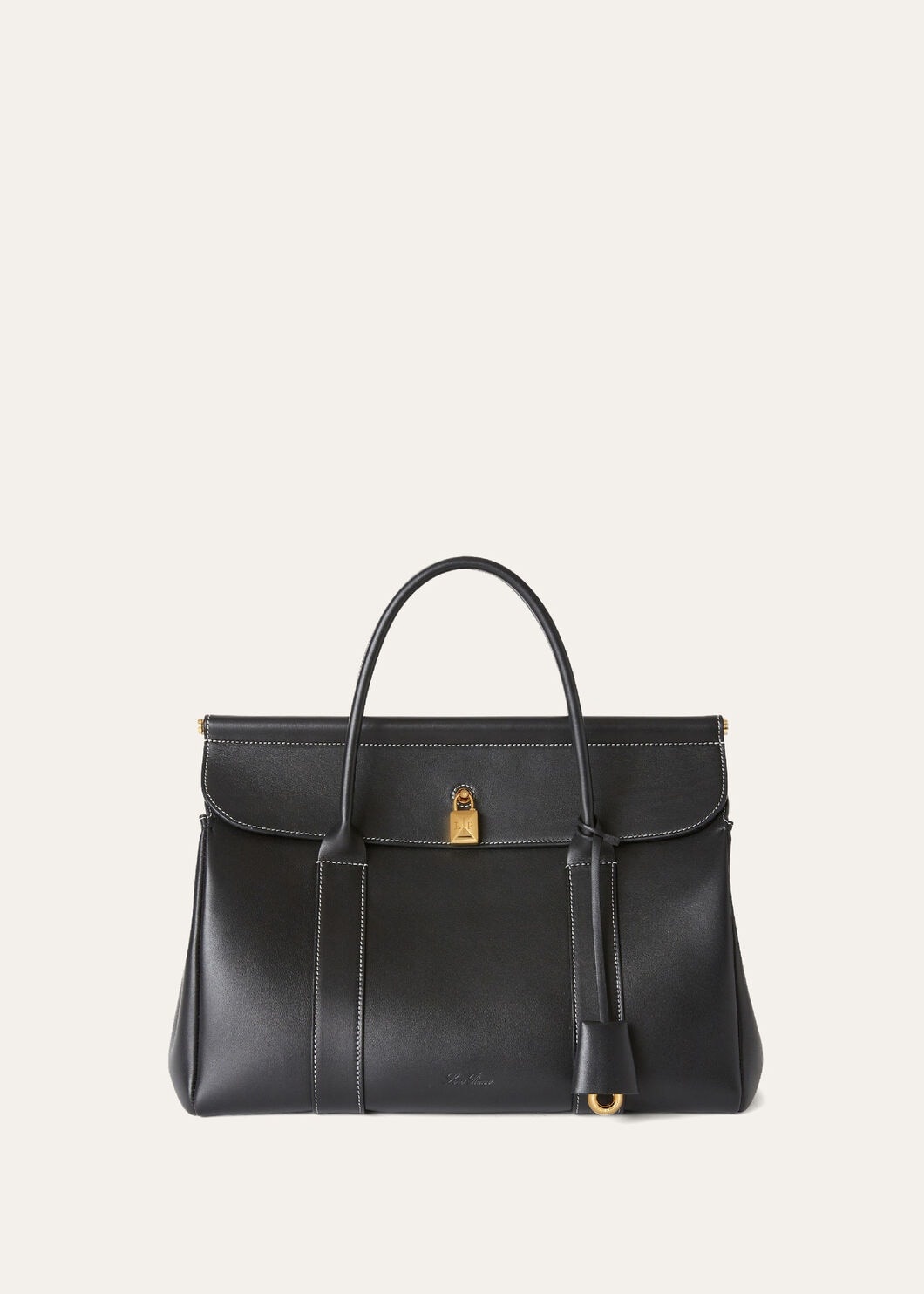 The Loom bag pays homage to Loro Piana's centuries-old textile heritage, with the metal bar beneath the flap evoking the gentle cascade of fabric draped across an artisan's loom - a subtle nod to the brand's storied weaving techniques. Uniquely textured yet lightweight in exclusive calfskin, the refined padlock that closes the bag can be unfastened, giving it a more relaxed look. Loom can be worn closed or open without losing any of its charm or personality. Even when worn unfolded, the bag gracefully closes by itself. Product details Leather handles Adorned with signature, interchangeable Loro Piana charms Open pocket inside in leather with logo Removable inner pouch in leather Ring-shaped protective feet on base Tonal logo on the front of the bag Dimensions: 33 x 23 x 18 cm | 9.4 x 12.6 x 7.1 in Handle length: 10 cm | 3.9 in Composition: 100% Calfskin Interior: 100% Suede Made in Italy Product Code: FAO0184