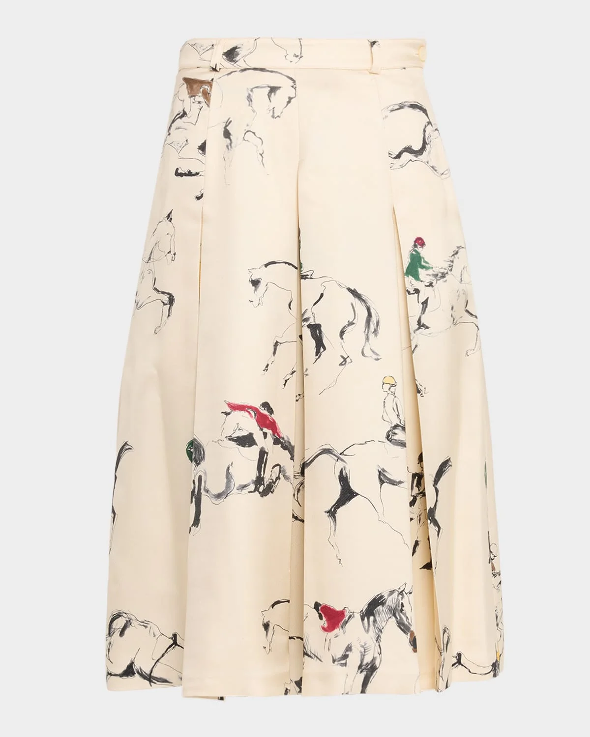 - Loro Piana "Mark" bermuda skirt finished with pleating and a horse print - high - High waist - Knee length - Skirt falls straight from hip to hem - Side button/zip fly; belt loops - Silk - Made in Italy