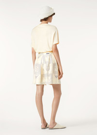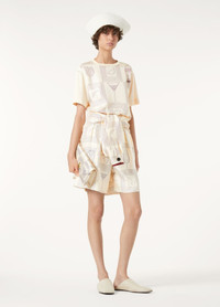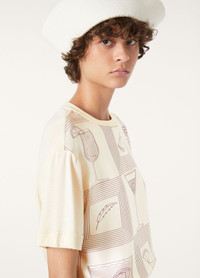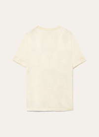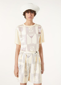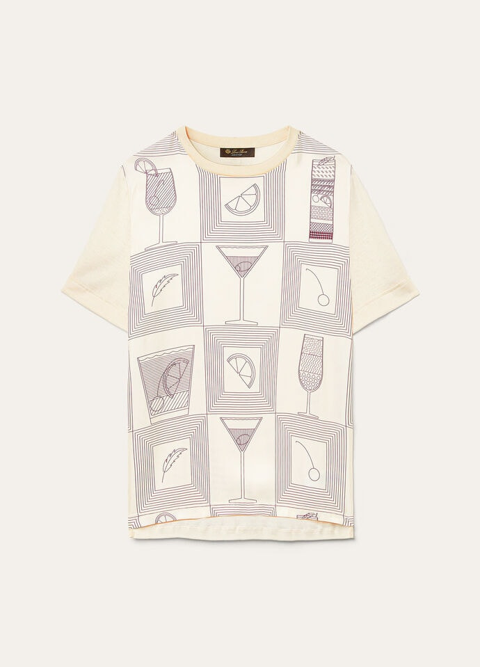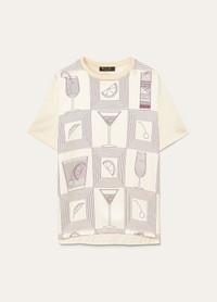 Rendered in a sumptuous blend of silk and cotton, the Mazzorbo T-shirt balances elegance with spirited charm. The lightweight ribbed jersey features a double-faced design: silk on the exterior for a luminous finish; cotton on the interior for a soft, breathable touch. A panel of shuttle-woven silk enlivens the front with the playful Aperitivo print. Cut for a relaxed fit with subtly dropped shoulders, it eases into the evening hours with refined nonchalance. Product details Ribbed crewneck collar Turned-up cuffs Short sleeves Aperitivo print at the front Relaxed fit Composition: 60% Silk, 40% Cotton Model wears an IT S Model measures: height 5′ 10″/ 179cm, bust 30.3″/ 77cm, waist 23.2″/ 59cm, hips 34.3″/ 87cm, shoes 15.4″/ 39cm. Made in Italy Product code: FAP0675