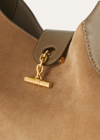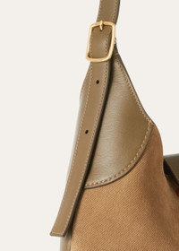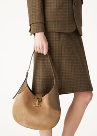 Elegant yet relaxed shoulder bag in a medium size. Named after the spool that holds thread or yarn, it is deeply rooted in the world of fabric-making, an intrinsic part of Loro Piana’s heritage. Elegant, functional, and timeless, it is ideal for the everyday. Part of the Bale family, its polished toggle closure and handle attachment subtly reference the iconic Bale bag. The delicate yet distinctive pinstripe pattern, carefully printed onto the suede, creates a sophisticated visual texture. Product details Internal card holder with embossed logo Hardware with Sun Gold finishing Lined in nappa Dimensions: 30 x 20 x 7 cm / 11.8 x 7.9 x 2.7 in Handle length: min 21 cm - max 32 cm / min 8.2 in - max 12.5 in Composition: 100% Calfskin Lining: 100% Calfskin Made in Italy Product code: FAO7425