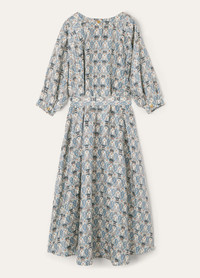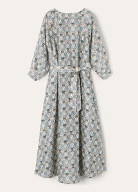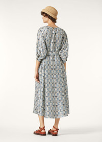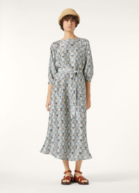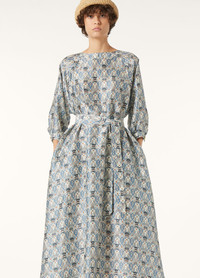 In lightweight silk shantung, the Mina dress is primed for effortless summer dressing. It is designed with a flowing skirt and matching belt to create an elegant, feminine silhouette. The delicate fabric is adorned with a tapestry of floral motifs and Loro Piana’s signature thistle, together forming the Cardo Veneziano print. Product details Round collar Flared silhouette Long dress Three-quarter sleeves Cuffs with metal button Single button fastening at the back Metal buttons Ribbon belt Cardo Veneziano print Oversized fit Unlined Composition: 100% Silk Model wears an IT 40 Model measures: height 5′ 10″/ 179cm, bust 30.3″/ 77cm, waist 23.2″/ 59cm, hips 34.3″/ 87cm, shoes 15.4″/ 39cm. Made in Italy Product code: FAP6652