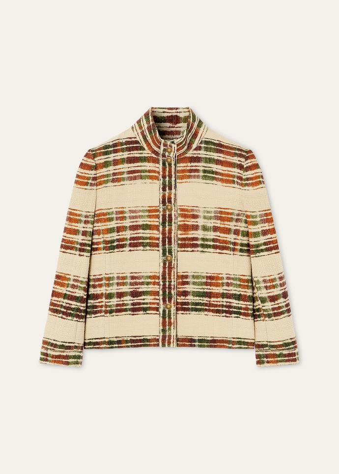 An expressive take on transitional outerwear, the Miriam jacket is decorated with the Suitcase Stripe in watercolor hues. It is woven from wool boucle to enhance the nuances of the motif and soft palette. The three-quarter sleeves are ideal for accentuating the cuffs of a tailored shirt. Product details Standing collar Three-quarter sleeves Folded buttoned cuffs Metal buttons Lined in silk satin Watercolor Stripe motif Composition: 100% Wool Made in Italy Product code: FAP7629