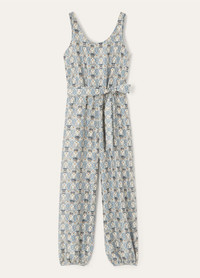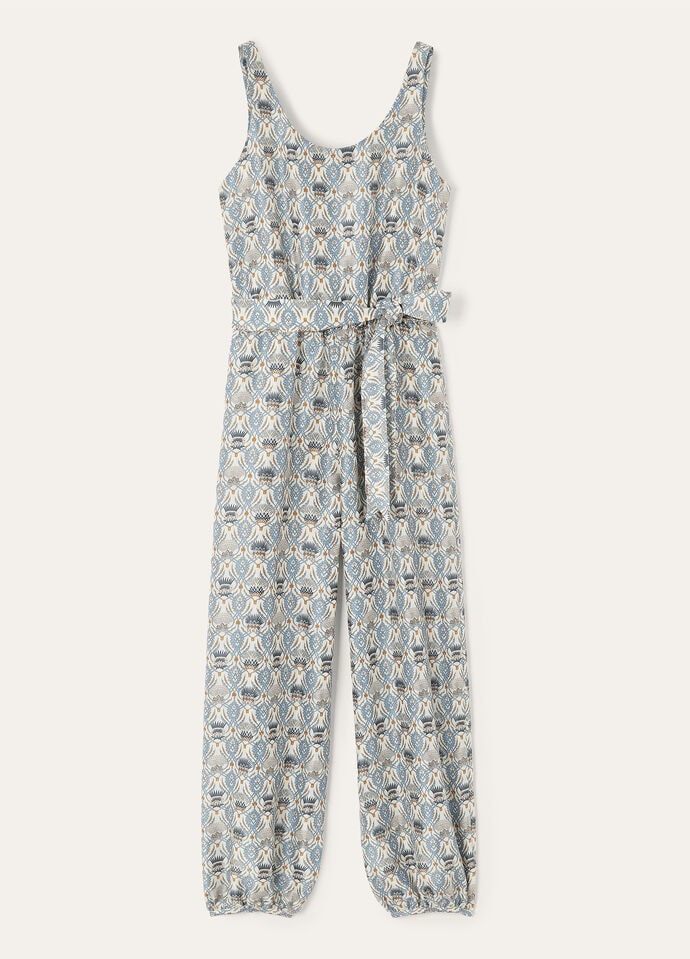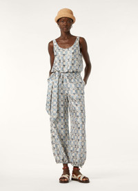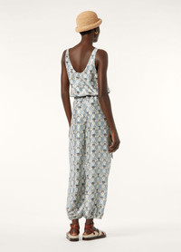 The Nadia jumpsuit is tailored from lightweight silk shantung, melding everyday elegance with a summery spirit. It features the Cardo Veneziano print, an intricate composition of thistle floral motifs framed in ornamental detail. The fabric’s satiny sheen highlights the refined irregularity of the weave, evoking the depth and texture of fine tapestry. Defined by a relaxed silhouette, the jumpsuit is cut with a tank-style top and a gently cinched waist. The trousers are tapered and gathered at the ankle with a cuff, creating a harmonious balance of structure and ease. Product details Elasticated waist Fluid, wide-leg silhouette Full-length romper with buttons at the cuffs Round scoop neck Straight side pockets Ribbon belt Double back slits Relaxed fit Unlined Composition: 100% Silk Model wears an IT 40 Model measures: height 5′ 11″/ 180cm, bust 31.5″/ 80cm, waist 23.6″/ 60cm, hips 35.4″/ 90cm, shoes 16.1″/ 41cm. Made in Italy Product code: FAP0258