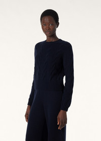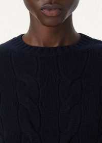 Cropped crewneck made from Coarsehair baby cashmere melange yarn. The weave is enhanced by an extremely soft, fluffy textured knit pattern, accentuating the cashmere’s naturally light weight. This flowing, cozy style is defined by a boxy cut. Product details Ribbed cuffs and hemComposition: 100% Baby Cashmere Made in Italy Product code: FAN1644